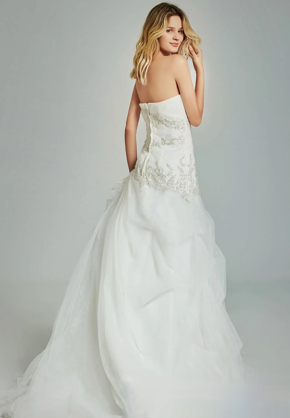 A Line Lace Wedding Dress Tulle Crystal Beaded Bridal Gown With Train, traditional with a touch of trendy style this bridal gown features a pleating bodice with crystal appliqués beading, frosted ruffled tulle ball gown skirt with a fluffy beautiful flounced overlay skirt completes the look. Dress shown in ivory