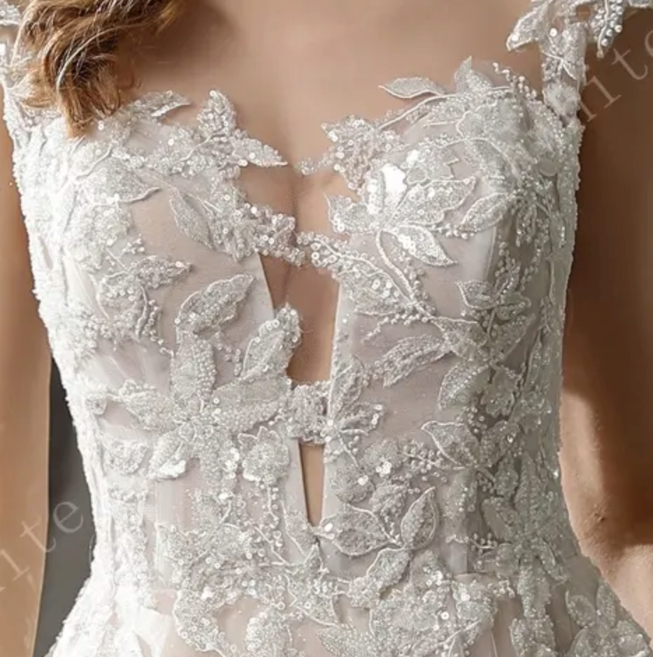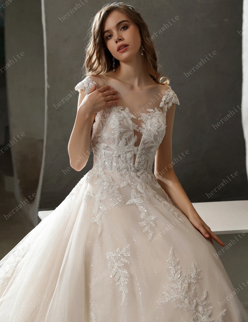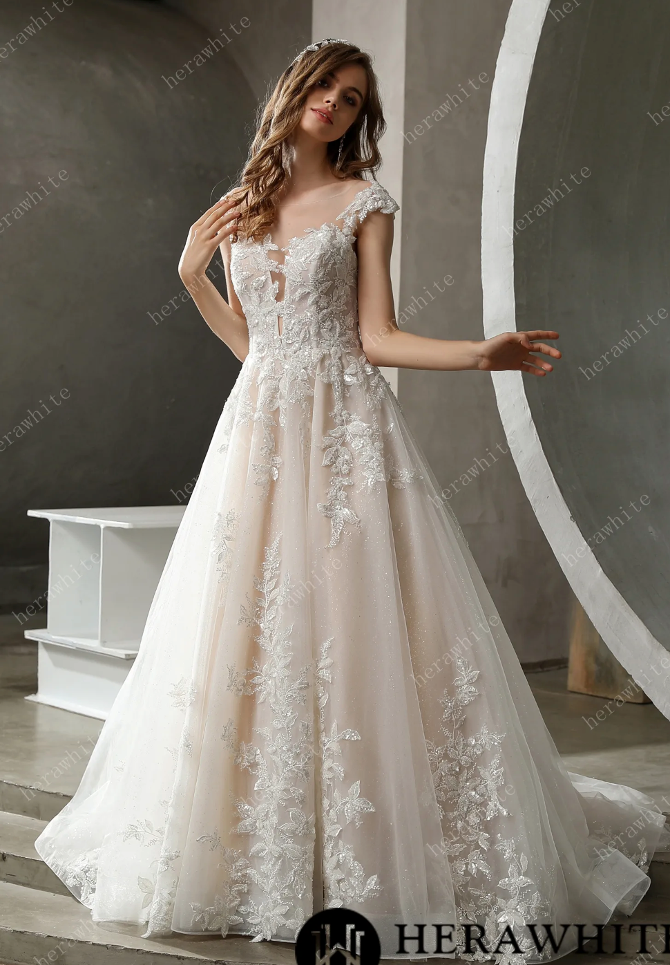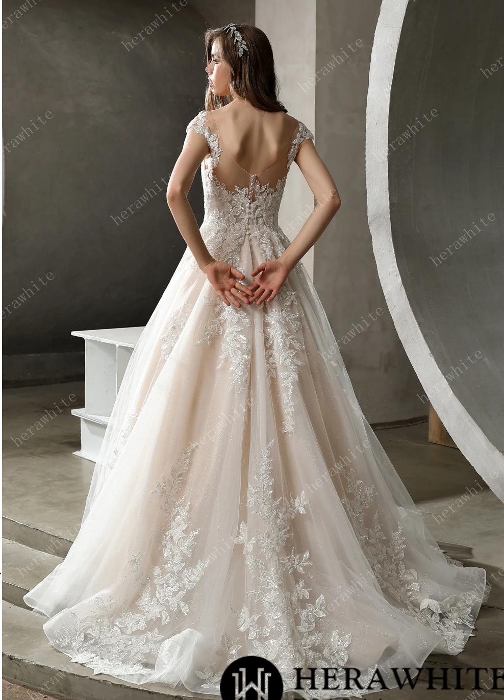 Beaded Lace Wedding Dress A Line Swiss Tulle Bridal Gown With Train, this A-line bridal gown is the definition of effortless beauty. It has an illusion neckline with heavy crystal beaded lace creating a sweetheart narrowed plunge through the center front on bodice. Short cap sleeves finish it off covering the shoulders with lace and gives way to a beautiful low back. The tulle skirt is layered with glitter tulle for an extra element of gorgeous shine, adding to the formality of this opulent style. This dress is shown in IVORY/CHAMPAGNE.