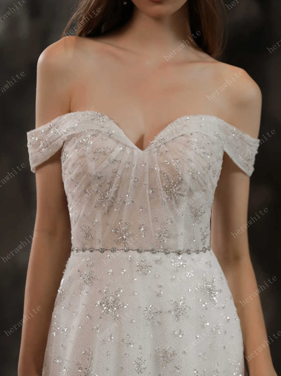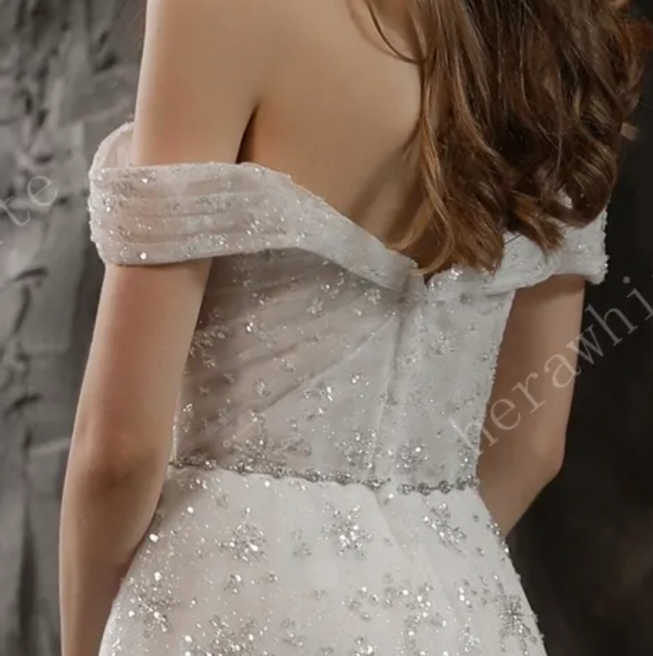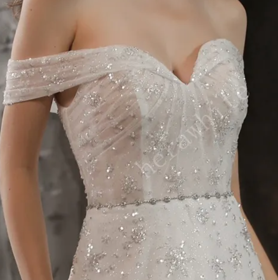 Beaded Lace Wedding Dress A Line Tulle Bridal Gown, this sparkling gown is sure to shimmer down the aisle with off the shoulder cuff sleeves and a sweetheart neckline with a beaded waist sash with the skirt continuing the sparkle to a low back with a slight train. The dress is shown in IVORY.