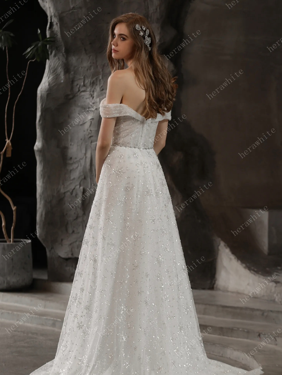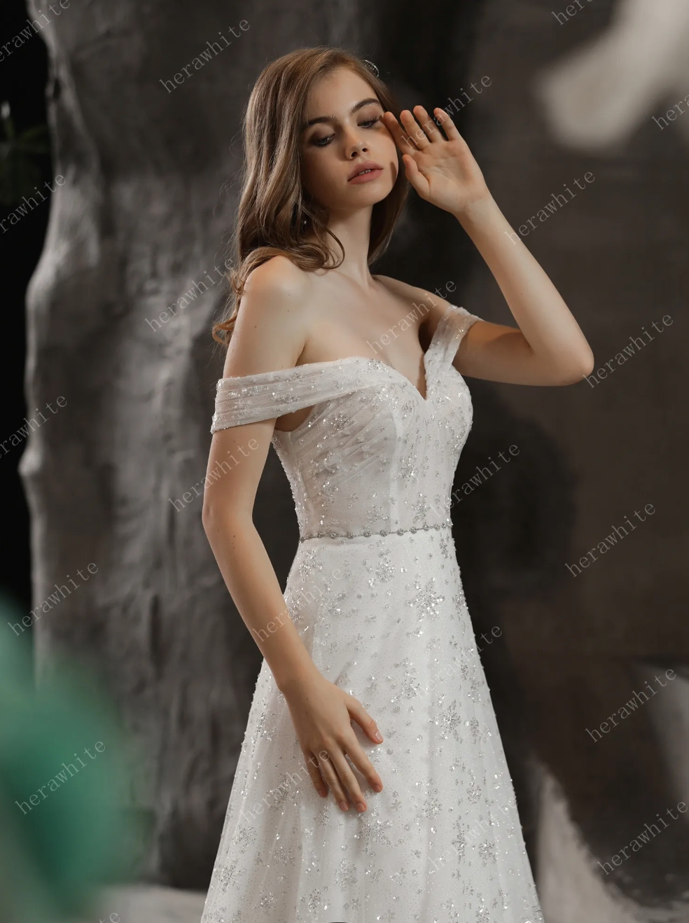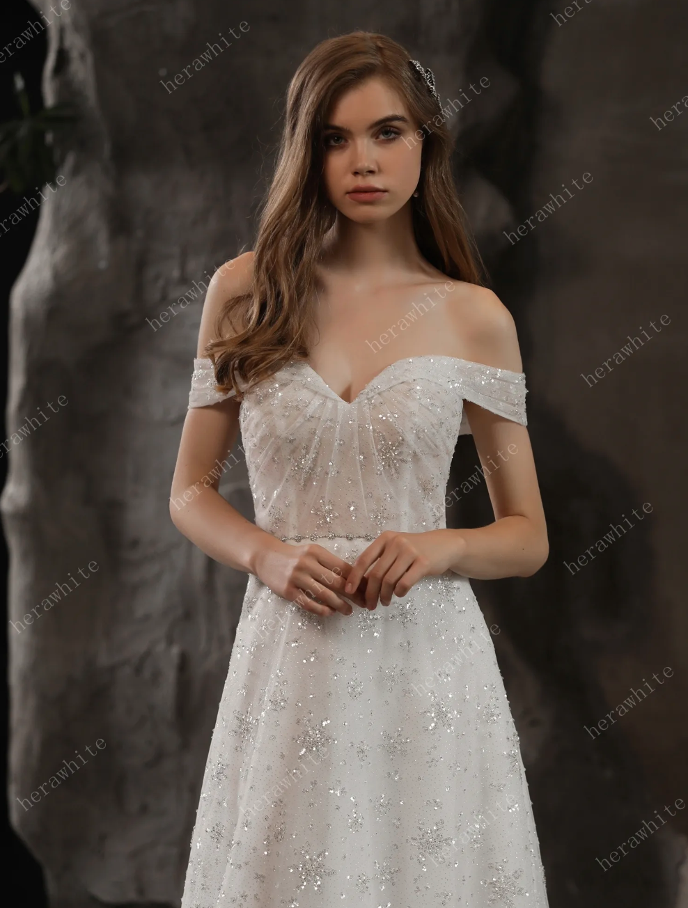 Beaded Lace Wedding Dress A Line Tulle Bridal Gown, this sparkling gown is sure to shimmer down the aisle with off the shoulder cuff sleeves and a sweetheart neckline with a beaded waist sash with the skirt continuing the sparkle to a low back with a slight train. The dress is shown in IVORY.