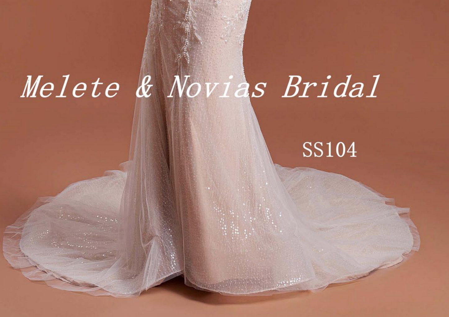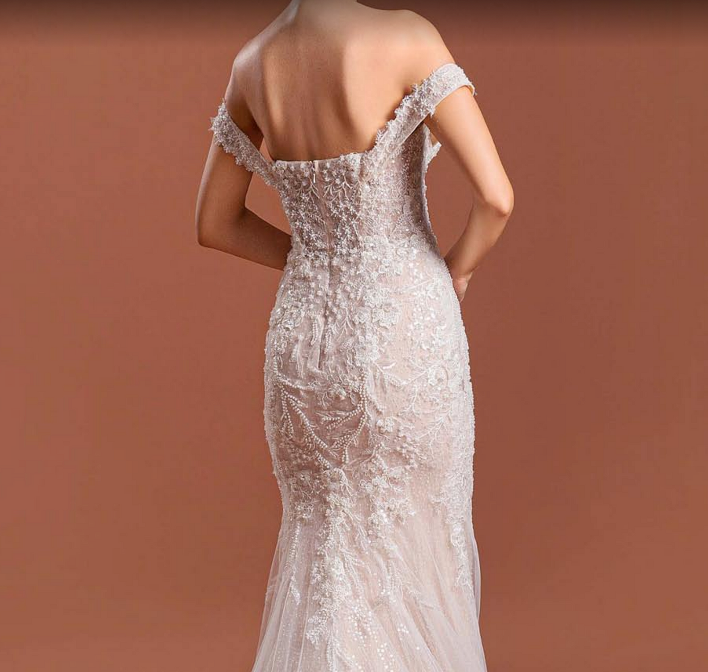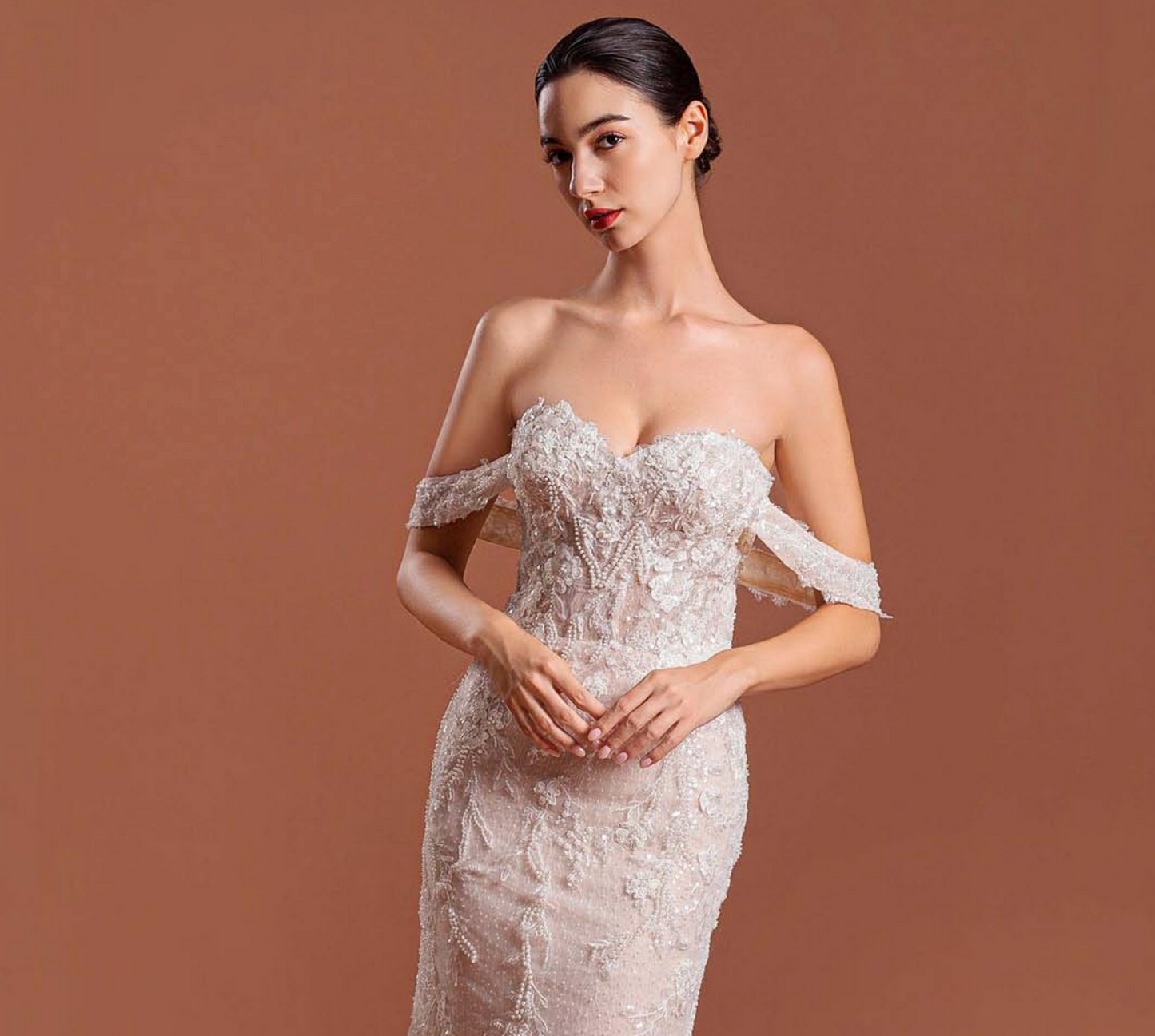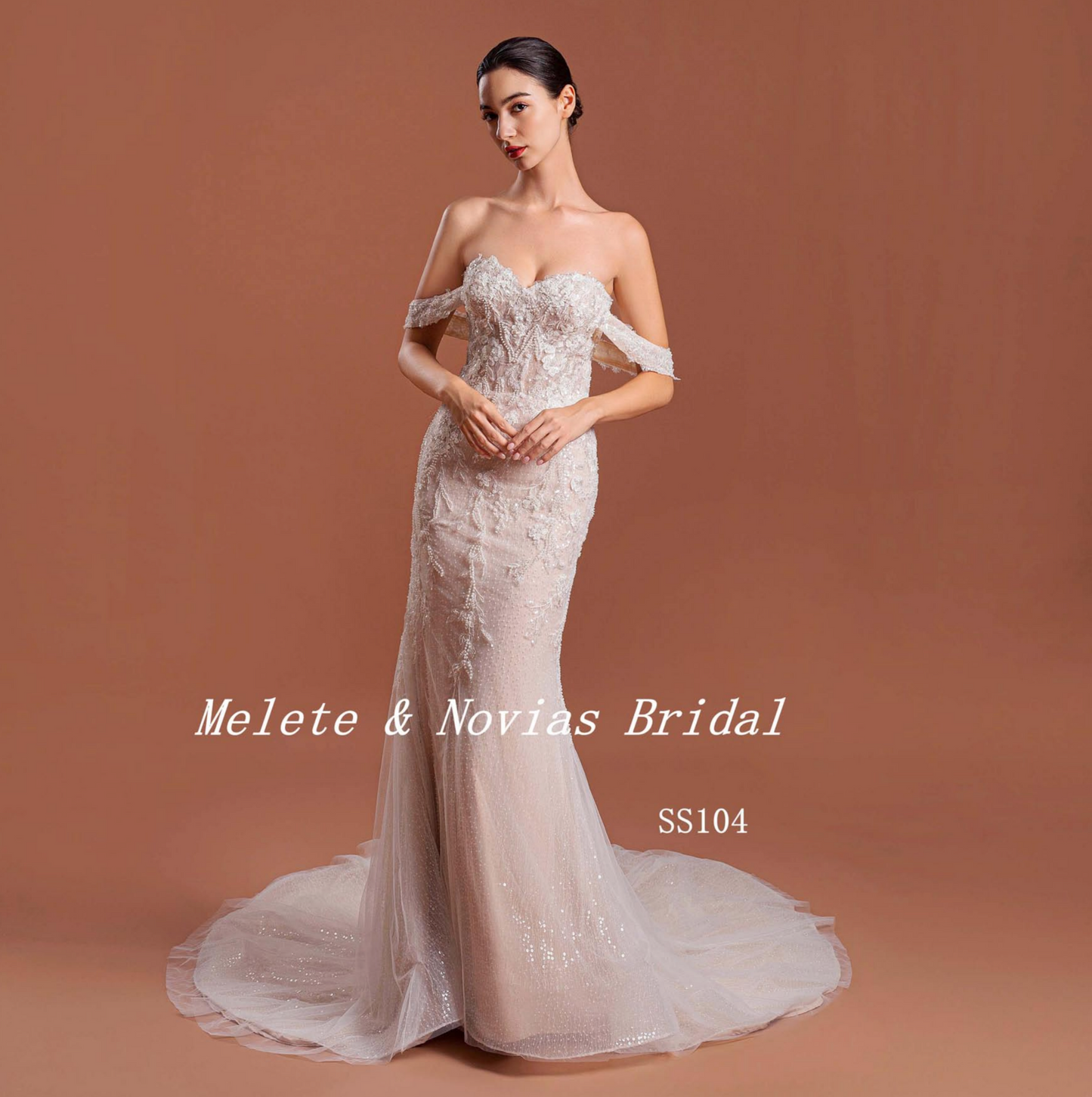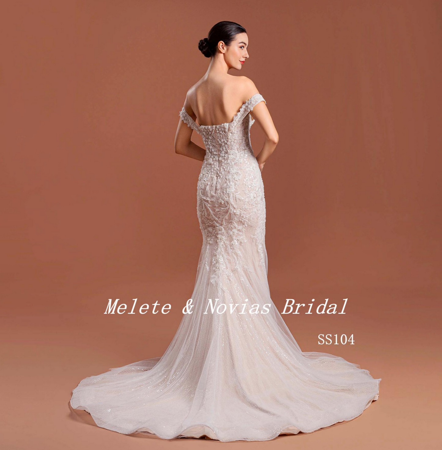 Beaded Mermaid Trumpet Sleeveless Bridal Wedding Gown, Get ready to shine on your special day in this stunning beaded mermaid wedding gown. The hand-beaded sweetheart bodice and off-the-shoulder cuffs add a touch of glamour, while the fitted mermaid skirt and slight train offer a sleek and elegant silhouette. Perfect for any formal occasion, this dress is sure to make you feel like a true bridal beauty.